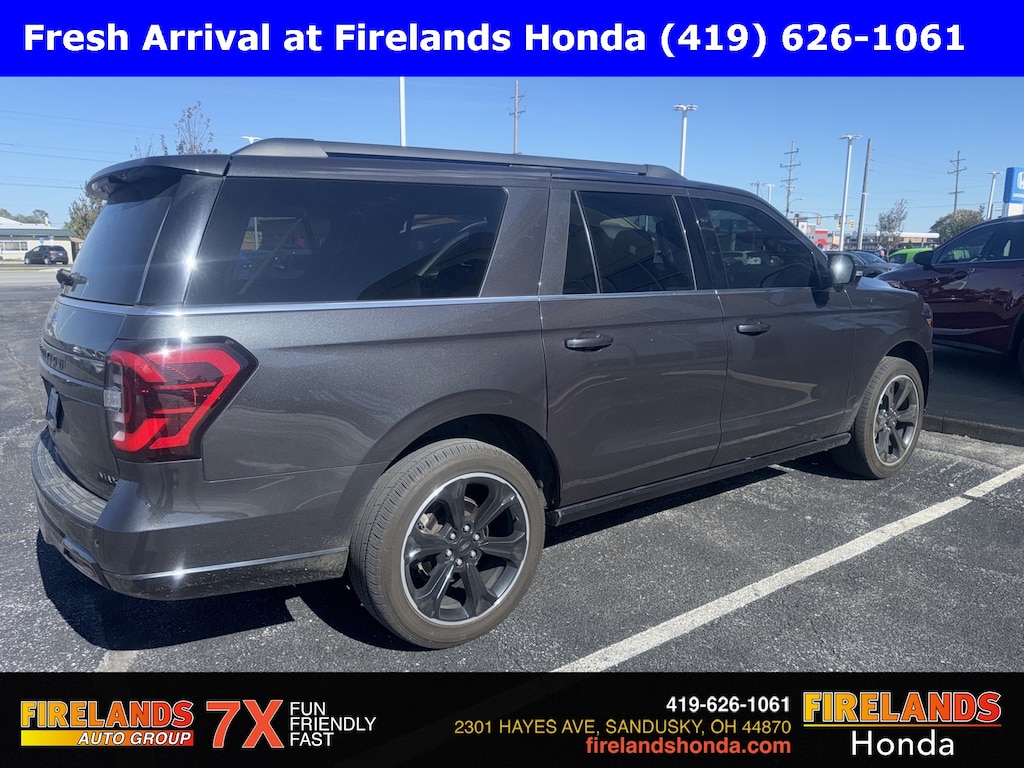 Firelands Honda is proud to offer this attractive-looking 2023 Ford Expedition Max in Dark Matter Metallic. This Expedition Max has been checked by our award winning service department. Hot features include: Bluetooth Hands Free, Back Up Camera, Navigation / GPS, Remote Start, Ventilated/Cooled Seats, Service Records Available, 4x4, Heated Leather Seats, 3rd Row Seating, Lane Departure Warning, Apple Carplay/Android Auto, Blind Spot Detection, Fog Lights, Automatic Emergency Braking, Forward Collision Warning, Rear Cross Traffic Alert, 360 Degree Surround View Camera System, Panoramic Moonroof, Clean CARFAX, One Owner, No Accidents, Trailer/Tow Package, Trailer Brake Controller, 7 Passenger Seating, Power Liftgate, 1st & 2nd Row Floor Mats w/Logo, 26mm Engine Radiator, 3.73 Axle Ratio, 360-Degree Camera w/Trailer Reverse Guidance, Black Headlamp and Fog Lamp Bezels, Black Limited Tailgate Badge, Black Rear Bumper, Black Roof Rack Side Rails, Body Color Door Handles, Ebony Black Bar and Mesh Grille, Ebony Black Power Deployable Running Boards, Ebony Black Tailgate Applique, Equipment Group 303A Stealth Package, Expedition Lettering on Hood, Heated/Ventilated Lthr Front Captain's Chairs (A), Heavy-Duty Trailer Tow Package, Integrated Trailer Brake Controller, LED Taillamp w/Black Bezels, Navigation system: Connected Navigation, Power-Folding Sideview Mirrors w/Autofold, Pro Trailer Backup Assist, Radio: B&O Sound System by Bang & Olufsen, SiriusXM w/360L, Sport Center Console, Sport-Tuned Suspension, Stealth Edition Package, SYNC 4 w/Enhanced Voice Recognition, Wheels: 22" Premium Black-Painted Aluminum.