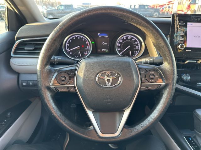 Step inside this Camry, and you'll be greeted by a spacious and well-appointed cabin. The fabric-trimmed seats offer exceptional comfort, while the split-folding rear seat provides versatile cargo-carrying capabilities. Stay connected with the intuitive infotainment system, which seamlessly integrates with your smartphone via Apple CarPlay and Android Auto.