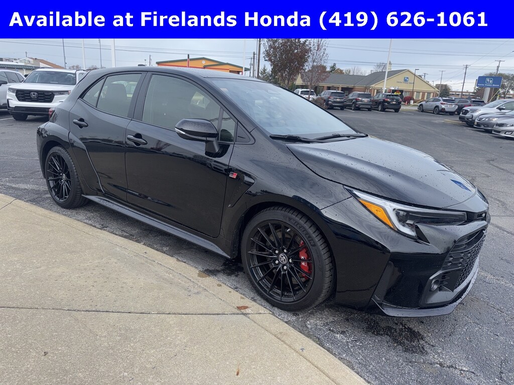 Firelands Honda is proud to offer this good-looking 2024 Toyota GR Corolla in Black. This GR Corolla has been checked by our award winning service department. Hot features include: Bluetooth Hands Free, Back Up Camera, Adaptive Cruise Control, Balance of Factory Warranty, Service Records Available, All-Wheel Drive, Lane Departure Warning, Apple Carplay/Android Auto, Blind Spot Detection, Automatic Emergency Braking, Forward Collision Warning, Rear Cross Traffic Alert, One Owner, Brembo Brakes, 6-Speed Manual, Sport Bucket Seats, 300HP of AWD Fun!, 4-Wheel Disc Brakes, 8 Speakers, ABS brakes, Air Conditioning, Alloy wheels, AM/FM radio: SiriusXM, Auto High-beam Headlights, Automatic temperature control, Brake assist, Brin Naub & Synthetic Leather Seat Trim, Bumpers: body-color, Compass, Delay-off headlights, Driver door bin, Driver vanity mirror, Dual front impact airbags, Dual front side impact airbags, Electronic Stability Control, Emergency communication system: Safety Connect (up to 10-year trial subscription), Exterior Parking Camera Rear, Four wheel independent suspension, Front anti-roll bar, Front Bucket Seats, Front fog lights, Front reading lights, Fully automatic headlights, Heated front seats, Heated Sport Front Seats, Heated steering wheel, Illuminated entry, Knee airbag, Leather Shift Knob, Leather steering wheel, Low tire pressure warning, Navigation system: Drive Connect Cloud Navigation (1-year trial subscription), Occupant sensing airbag, Outside temperature display, Overhead airbag, Overhead console, Panic alarm, Passenger door bin, Passenger vanity mirror, Power door mirrors, Power steering, Power windows, Radio data system, Radio: Toyota Audio Multimedia w/8 JBL Speakers, Rear anti-roll bar, Rear seat center armrest, Rear side impact airbag, Rear window defroster, Rear window wiper, Remote keyless entry, Security system, Speed control, Speed-sensing steering, Split folding rear seat, Spoiler, Sport steering wheel, Steering wheel mounted audio controls, Tachometer, Telescoping steering wheel, Tilt steering wheel, Traction control, Trip computer, Turn signal indicator mirrors, Variably intermittent wipers, Wheels: 18" Gloss Black 15 Spoke Cast Alloy.